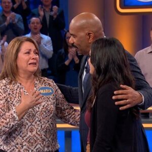 The tears came without warning, streaming down 16-year-old Sophia Rodriguez’s face as she stood at the Family Feud podium, her hand instinctively moving…