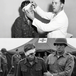 April 1945, a United States Army medical officer stands in the intake facility of a prisoner of war camp somewhere in the middle…