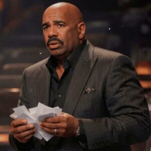The studio lights are bright. The audience is cheering. The scoreboard is lit up like a carnival. And Steve Harvey is standing center…