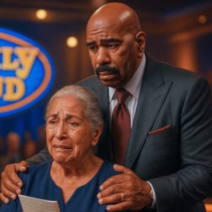 The cards scattered across the Family Feud stage like fallen leaves as Steve Harvey’s hands went limp. His trademark smile vanishing in an…