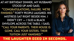 The laughter stopped. Phones began to buzz across the table. Someone stood too fast and knocked over a chair. Daniel stared at the envelope, his smile frozen, his confidence cracking. I smoothed my dress and turned away. As I walked out of the room, I did not look back. I did not need to. That was the moment everything he built began to fall apart.