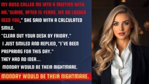 They didn’t even try to hide the satisfaction in their voices. After fifteen years of dedicated service, I was being let go. Just like that. A short meeting, two cold smiles, and a manila folder slid across the table.