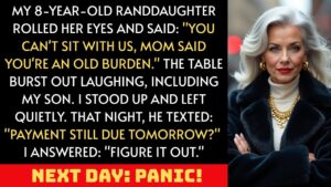 My granddaughter Lucy looked up at me with innocence sharpened into something cruel, something borrowed from another voice. “You can’t sit with us,” she said. “Mom said you are an old burden.” Every fork paused. Glasses stilled midair. Then came the sound, a ripple of laughter beginning with the adults. Even my son Michael let out a short laugh—the kind people make when they think disrespect is adorable. Vanessa smirked into her wine like she had trained the moment herself.
