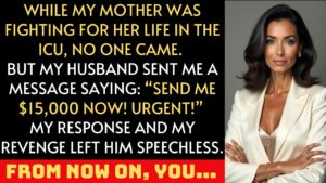 Two hours later, still sitting in that hallway with swollen eyes and trembling hands, my phone lit up again. I hoped it was Marcus asking about my mother. Instead, it was a message that said, “Send $15,000 today.” No concern, no compassion—just entitlement.