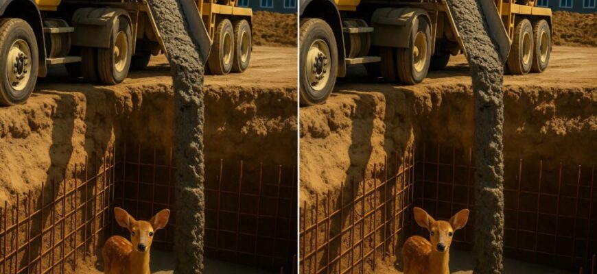 I dropped my tools and rushed over, my heart pounding. Four other workers joined me at the edge, peering down at the struggling fawn. Its legs flailed, splattering cement, its cries thin and pitiful.