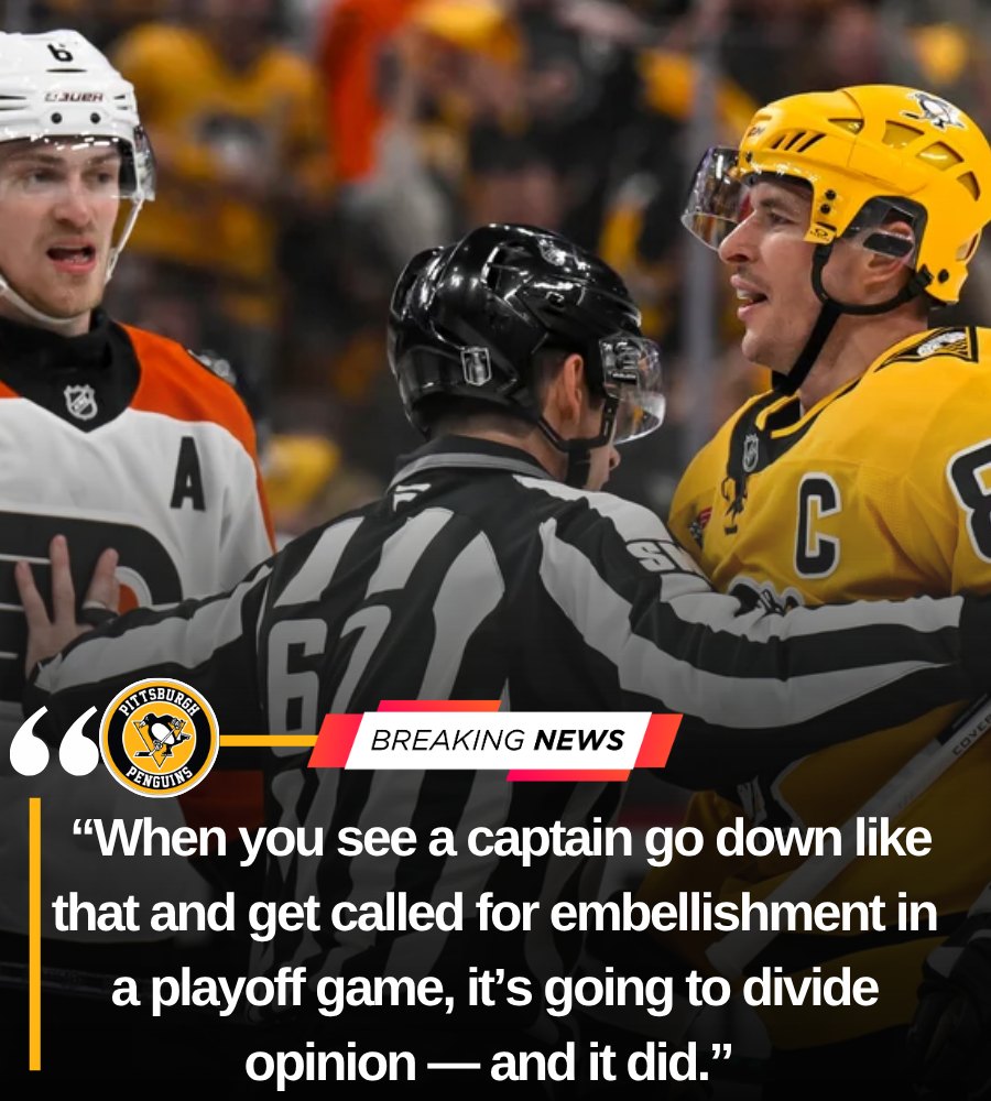 Sidney Crosby, the Penguins’ captain and one of the most respected players in the game, was penalized for embellishment after a dramatic fall near the crease—a call that instantly ignited outrage across the arena and online.