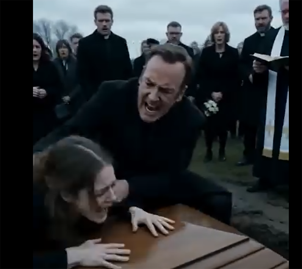 Gasps rippled through the mourners. Some stepped back instinctively, unsure whether they were witnessing overwhelming grief or something far more unsettling. The priest, who had been speaking moments earlier, fell silent mid-prayer, his words dissolving into the air as all attention shifted to the chaos unfolding before him.