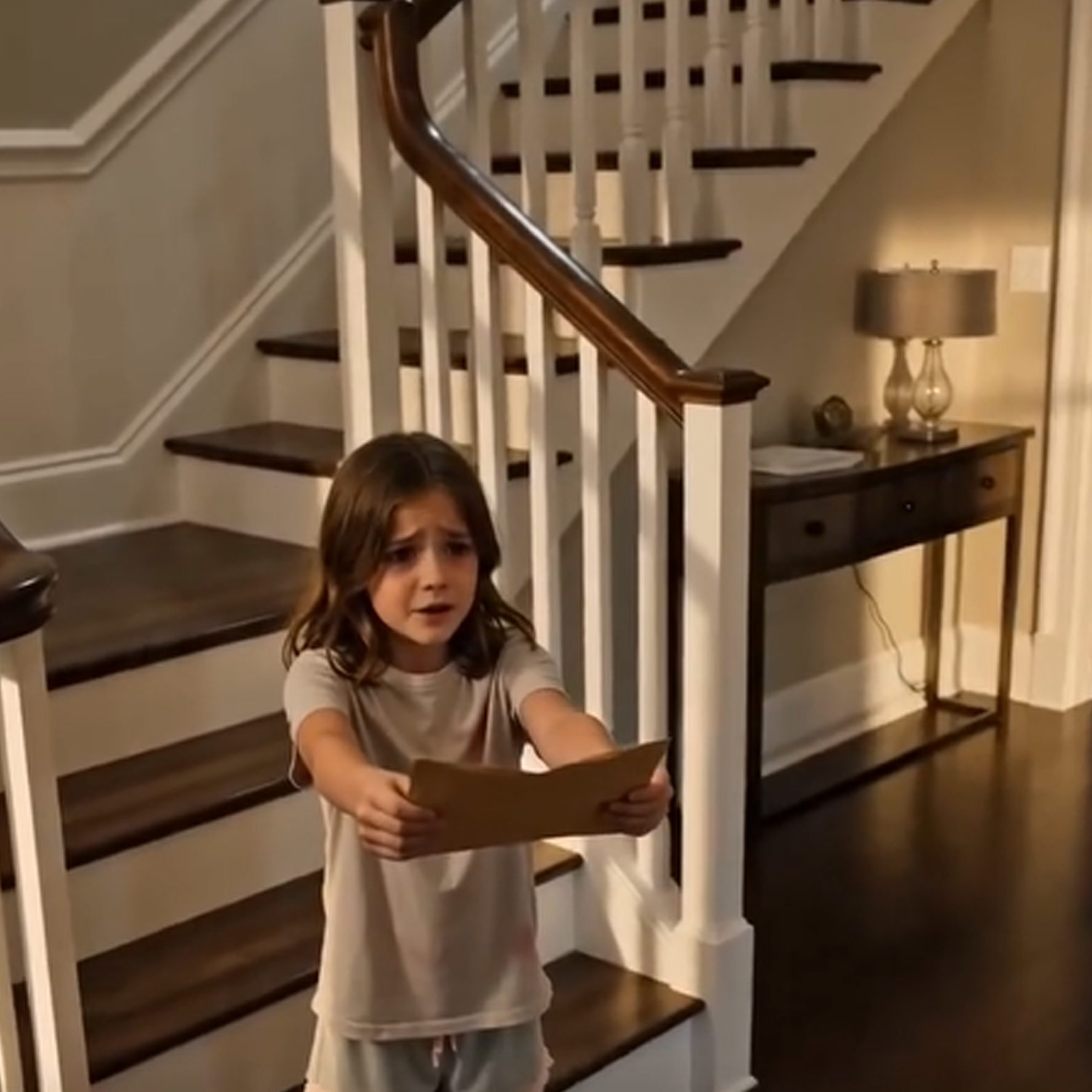 Downstairs, Emma didn’t dare move. She clutched the banister, her small fingers white, watching the moment stretch like it might snap.