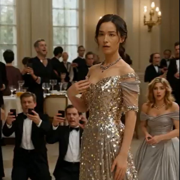 No one expected the night to break like this. The ballroom shimmered with perfection—golden chandeliers, soft music, controlled elegance. Every movement felt rehearsed, every smile carefully measured. Wealth lived comfortably here, quiet and unquestioned. And in the center of it all, she didn’t belong. A maid in simple clothes, head slightly lowered, a cloth still in her trembling hand. Invisible in the way people become when they’re expected to be.
