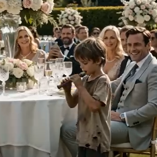 At the center of the pristine white linen tables, where wealth and elegance had arranged themselves like a carefully staged painting, stood something completely out of place—a thin, dirt-streaked boy in worn clothes, clutching a wooden flute as if it were the only thing anchoring him to the world.
