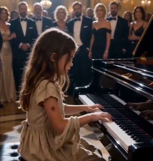 She walked toward the grand piano at the far end of the room, her bare feet silent against the marble. No rush. No fear. Just something steady—something that didn’t match the way she looked.