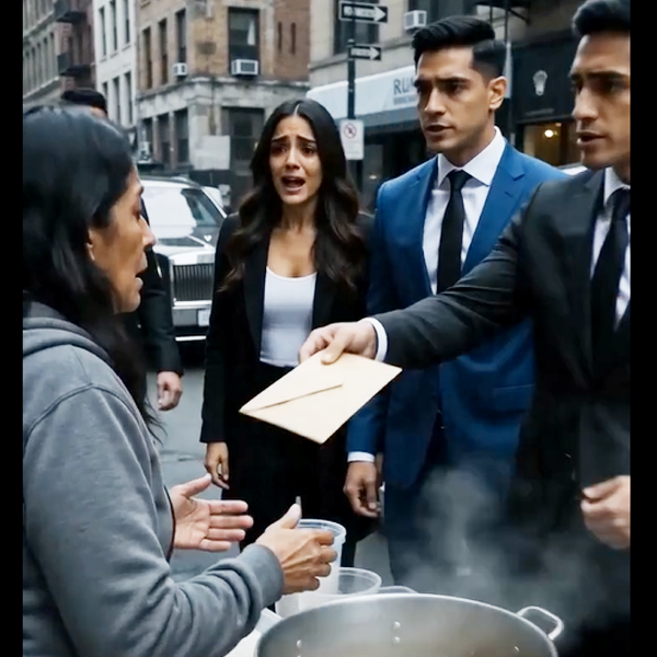The man who handed her the envelope steps closer again—but this time, he doesn’t reach into his coat.