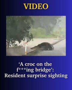 A giant crocodile has been filmed casually crossing a bridge in Far North Queensland before slipping into floodwaters.