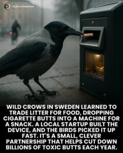 In Sweden, wild crows have learned a unique trick: exchanging cigarette butts for food. A local startup built a machine that rewards crows with a snack for depositing cigarette butts. It didn’t take long for these clever birds to catch on, quickly becoming skilled at collecting the butts from around the city.