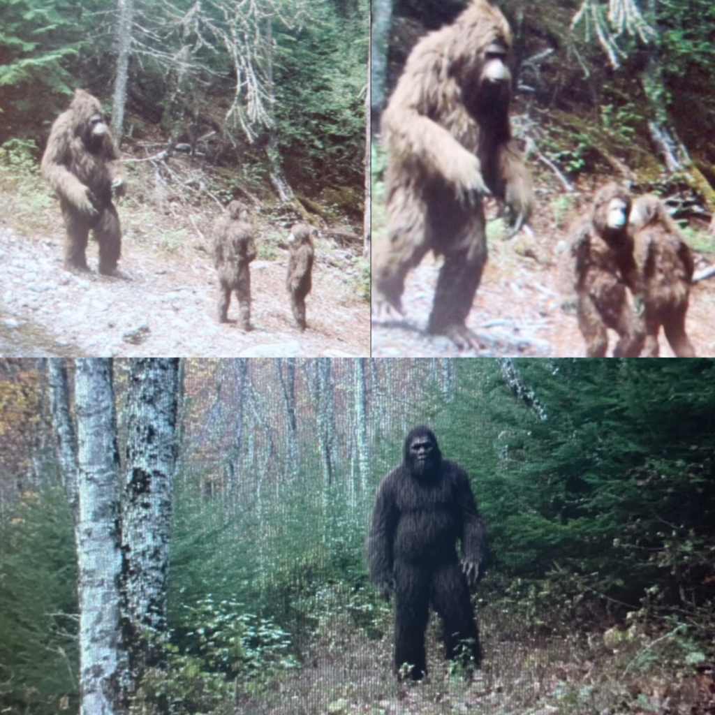 The larger adult—the male—was enormous. Eight to nine feet tall if my distance and angles were right. Broad shoulders, long arms, thick dark hair that blended with the shadows until he moved.