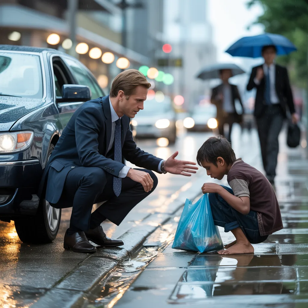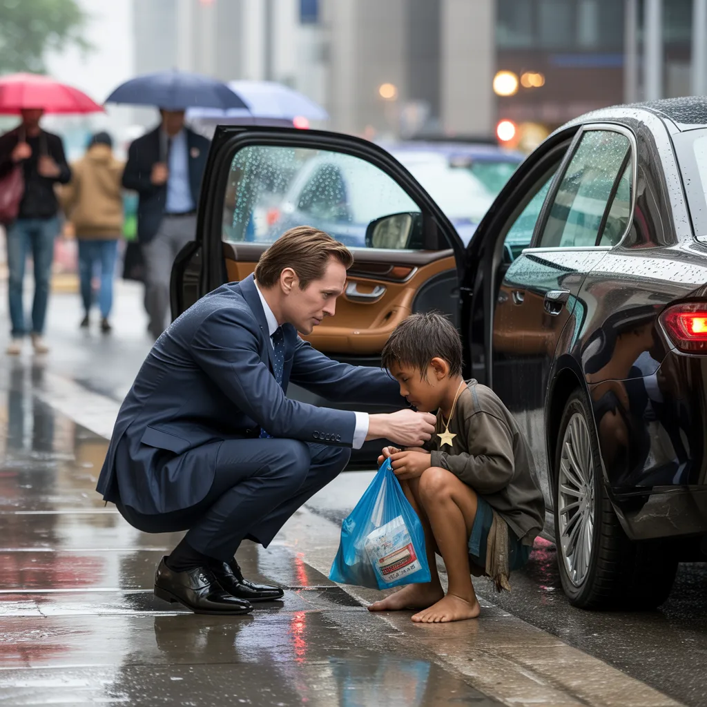 The boy noticed him then. There was a flicker of fear in his expression, followed by a swift recoil as if instinct had taught him that adults, especially wealthy ones in shiny cars, were not to be trusted. His small fingers clutched the plastic bag tighter, and his body tensed, ready to bolt at the slightest provocation.