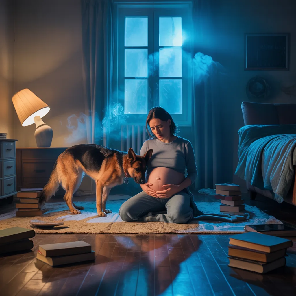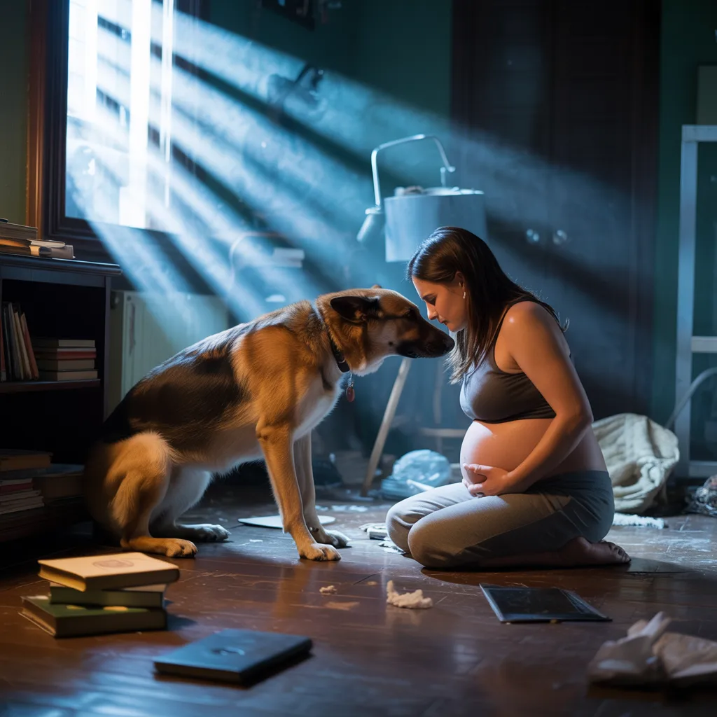 His ears flattened, his eyes clouded with distress, his gaze flicking repeatedly toward the front door and then back to her belly as if torn between two threats, unsure which one would reach her first.