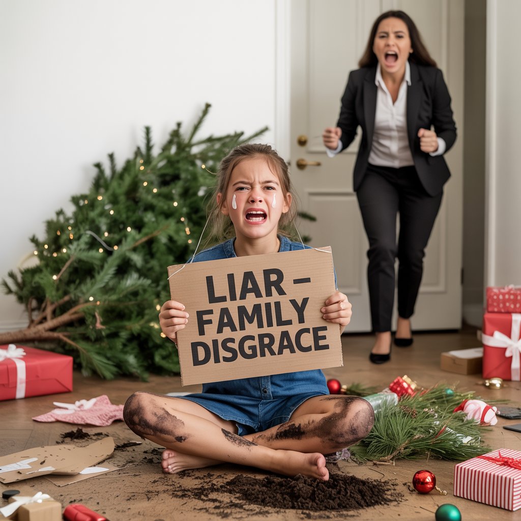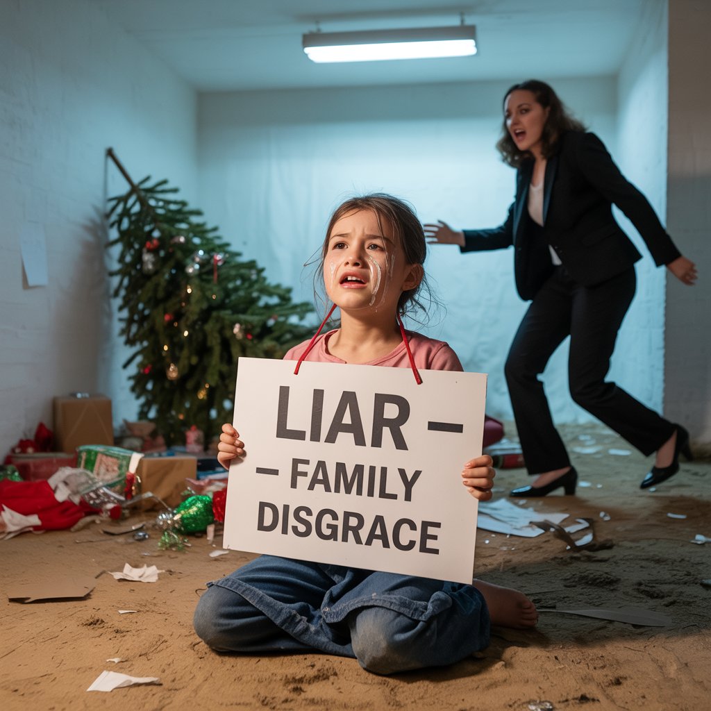 I followed her gesture and froze. Ruby was standing in a corner, her fancy Christmas dress ripped and smeared with dirt. Across her forehead, someone had scrawled the word *LIAR* in black marker. Around her neck hung a cardboard sign that read *FAMILY DISGRACE*. Her small frame trembled, and tears welled in her eyes.