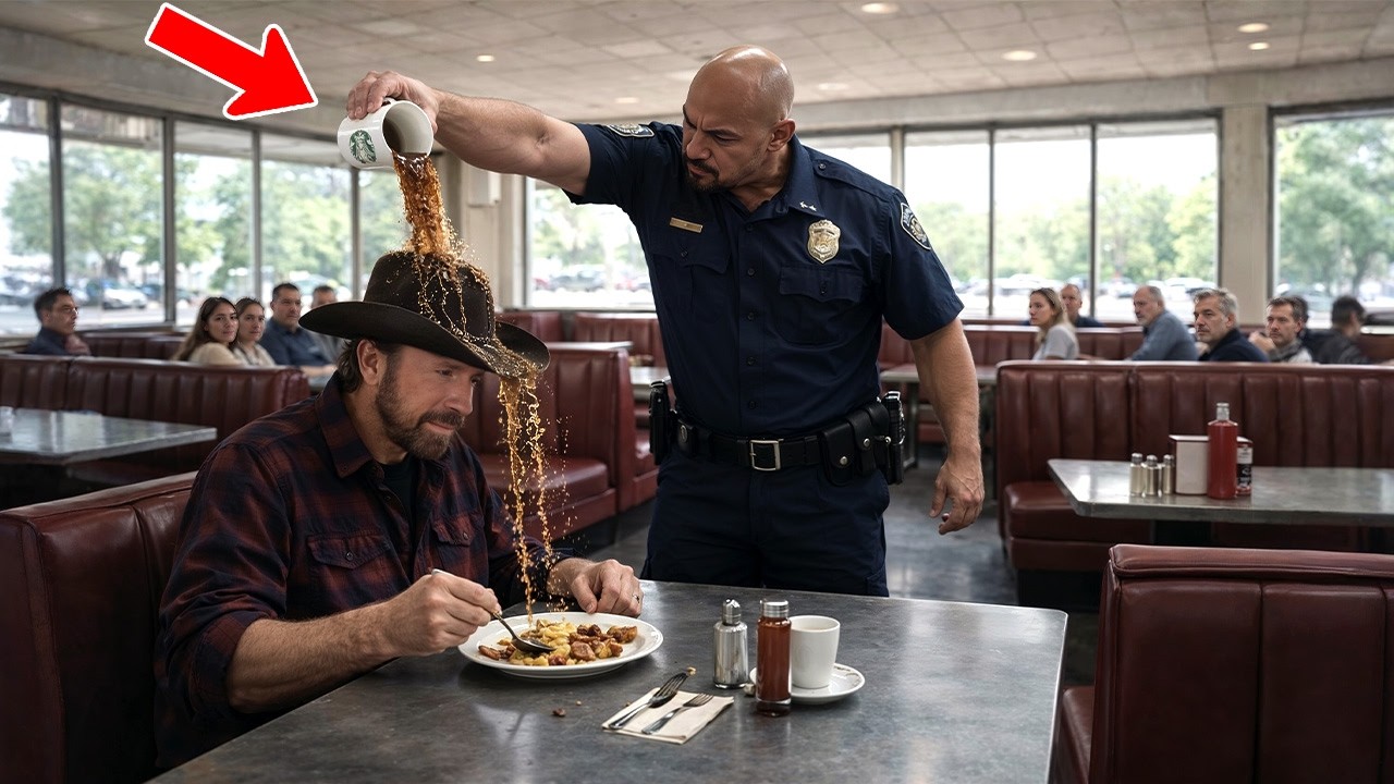 Chuck Norris walks into a diner and a police officer publicly humiliates him by pouring coffee on him, thinking he can get away with it, but he chose the wrong man. What happens next will shock you. Subscribe to the channel and comment where you’re watching from. Chuck Norris turned off the highway without any particular thought, guided less by hunger than by habit. Long stretches of road had taught him that the body often noticed what the mind ignored, and the quiet pull toward the small diner ahead felt familiar. The
