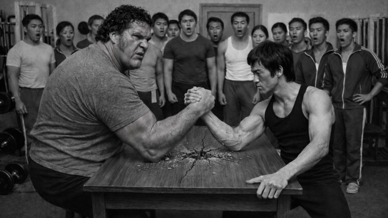 about beating Andre. Was about showing where strength goes when you give it direction.” The class resumes. Students practicing with new energy, new understanding. The broken table stays in the center of the gym for the rest of the day. Physical reminder evidence. Nobody moves it until closing. When they finally carry it out, the split is clean. Perfect center break. The kind of break that requires immense force applied precisely. Years later, people who trained at that gym tell the story. Andre the Giant arm wrestled Bruce Lee.