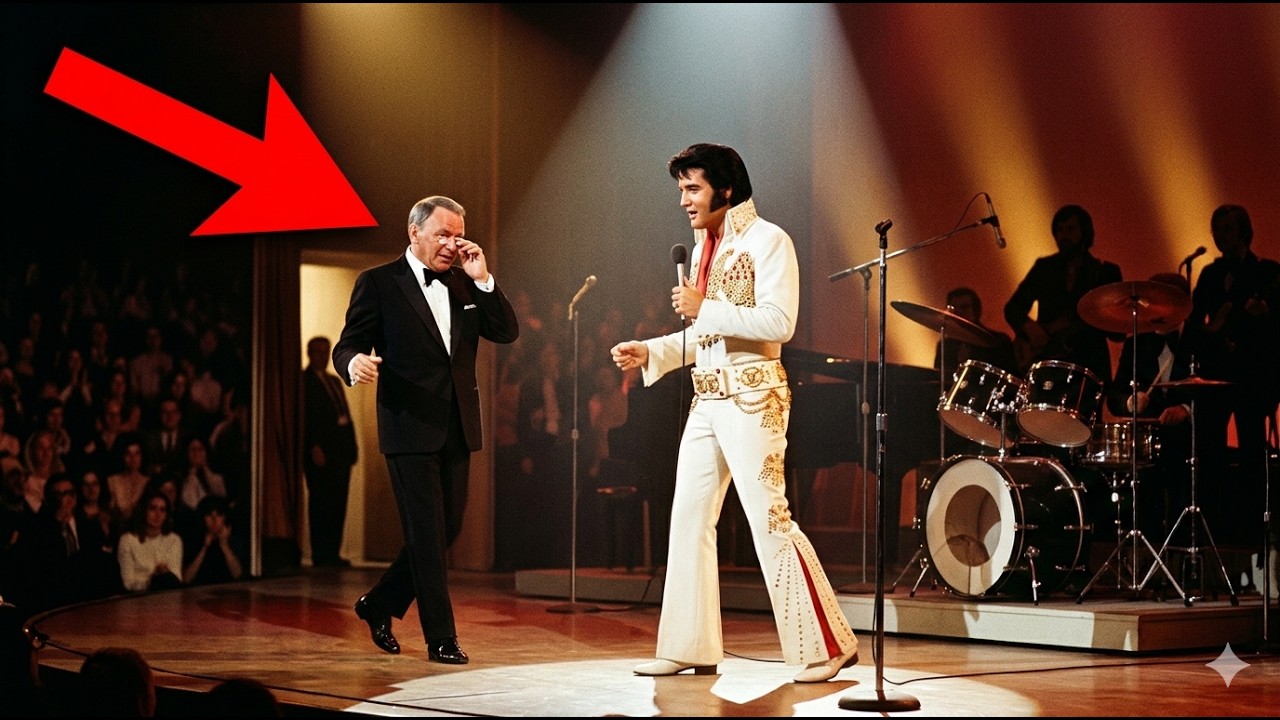 pointing, started understanding that Frank Sinatra had just walked onto Elvis Presley’s stage, started feeling the electricity, started knowing something significant was happening. Elvis was facing the audience, was midverse, was singing, saw the audience’s reaction, saw people pointing, saw attention shifting, turned, saw Frank Sinatra standing on his stage in the middle of his show looking at him. What Elvis did next shocked everyone in that room. Shocked Frank most of all. Shocked 2,000