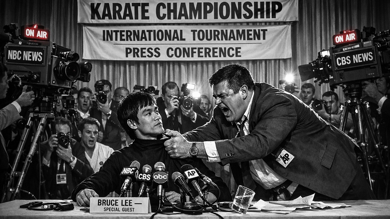 Stand up. Let’s see if your philosophy works when someone actually tests it. Bruce remains seated. Says, “This isn’t appropriate venue. This is press conference, professional event.” Frank’s face reens. interprets refusal as fear as admission. His hand moves fast, aggressive, reaches across table, grabs Bruce’s collar, both hands, tight grip, pulls forward. I said, “Stand up.” Frank growls. Show these people your kung fu dancing. The ballroom freezes. 300 journalists staring. Five television
