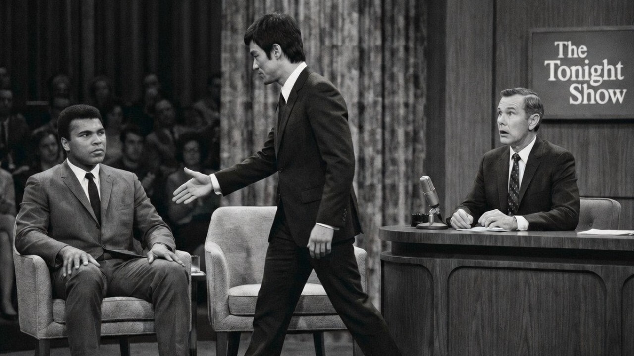 Carson and Ally chat during the break. Something about golf. Both men laughing. The stage manager counts down silently with his fingers. 5 4 3 2 points. They’re live. Carson pivots to camera with practiced ease. My next guest is a martial arts expert and actor. You might remember him as Kato on the Green Hornet. He has a new film project in development. Please welcome Bruce Lee. The band plays not as enthusiastically as for Ali, but professional. The curtain parts. Bruce walks through. The applause is polite,