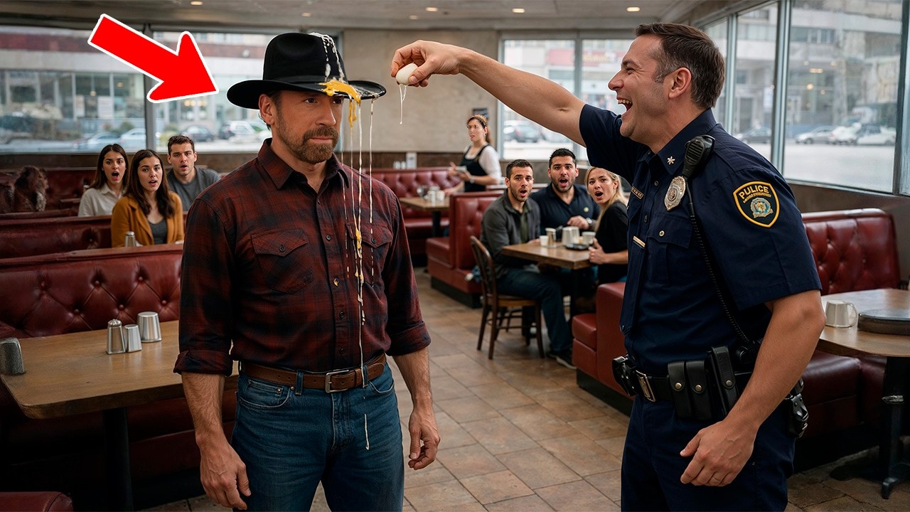 He walked into a cafe like an ordinary customer, but a police officer decided to humiliate him and cracked an egg right over his head. The entire place froze because no one expected what would happen next. Watch till the end, subscribe, and tell us in the comments what you would do in his place and where you’re watching from. Chuck Norris turned off the highway without any sense of arrival. The diner appeared the way places like that always did, sudden unannounced, standing alone beside the