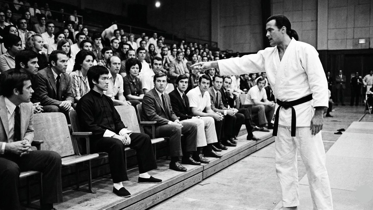 the bleachers that one of his training partners leans toward him and says something quietly. Seigal turns and looks toward the third row of the bleachers. He is looking at Bruce Lee, who is sitting where he has been sitting since he arrived in the dark jacket, still watching the next group of competitors warming up on the far side of the floor. Seagal looks for a moment with the expression of someone processing a piece of information and deciding what to do with it. Then he says something to his partner and begins