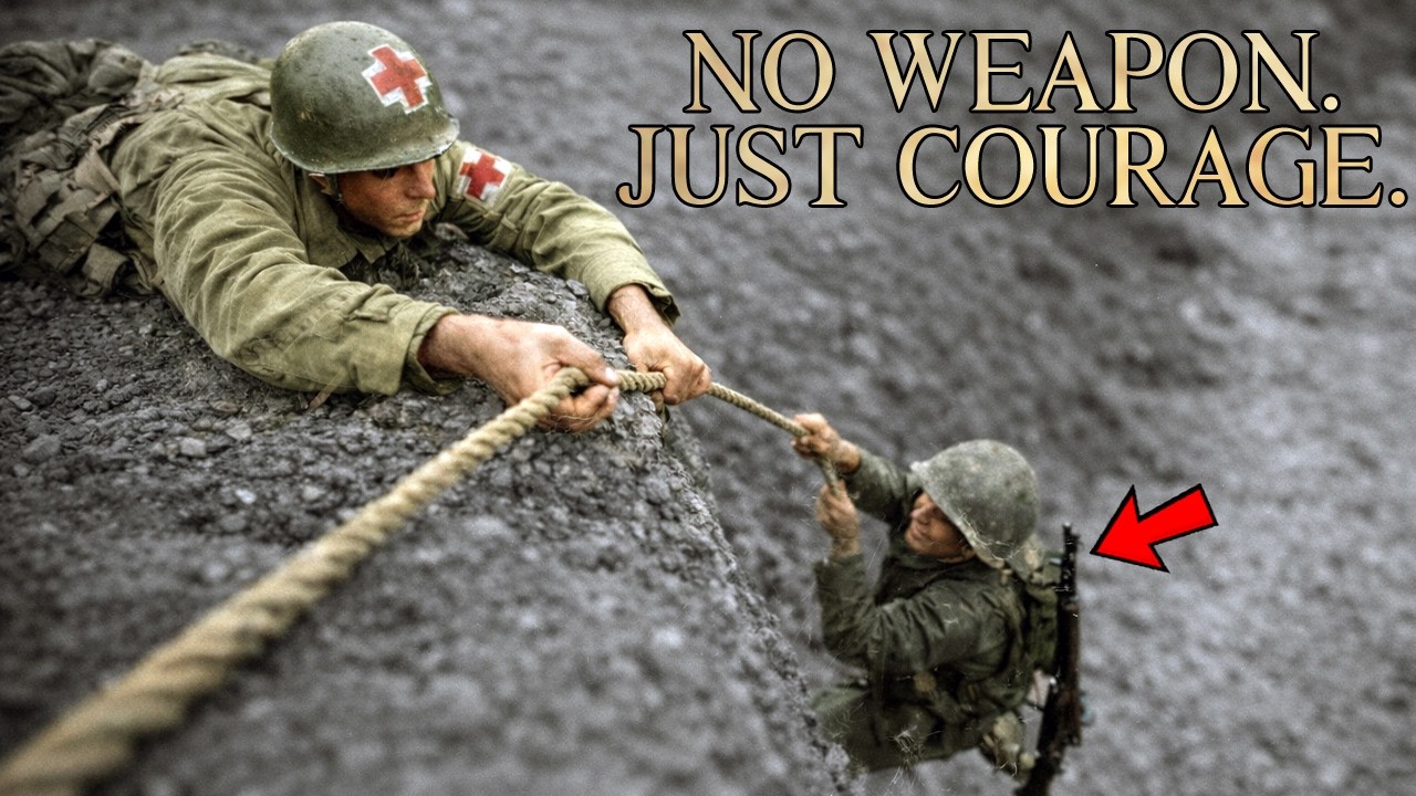 Private First Class Desmond Doss stayed behind, alone and unarmed in the most dangerous place on the battlefield. For the next 5 hours, Doss crawled through machine gun fire and mortar explosions, dragging wounded soldiers one by one to the cliff edge. He fashioned a rope system using a special knot and lowered each man down the sheer rock face to safety below.