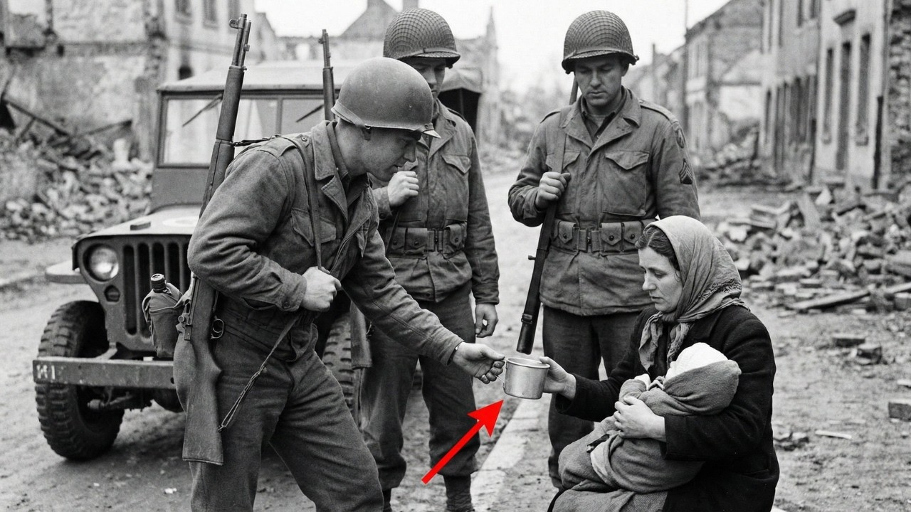 Snow melts into gray slush along a ruined road in western Germany. It is March 1945. A young woman stands under guard. Her coat is thin. Her hands shake. She clutches a bundle wrapped in a faded blanket. Inside it, a baby cries. The sound is weak. The woman has not eaten properly in days. Neither has the child. American soldiers move past her. Their boots splash through water mixed with ash. One of them stops. He looks at the baby. He reaches into his pack. He pulls out a metal can, powdered milk. He kneels. Another soldier finds a