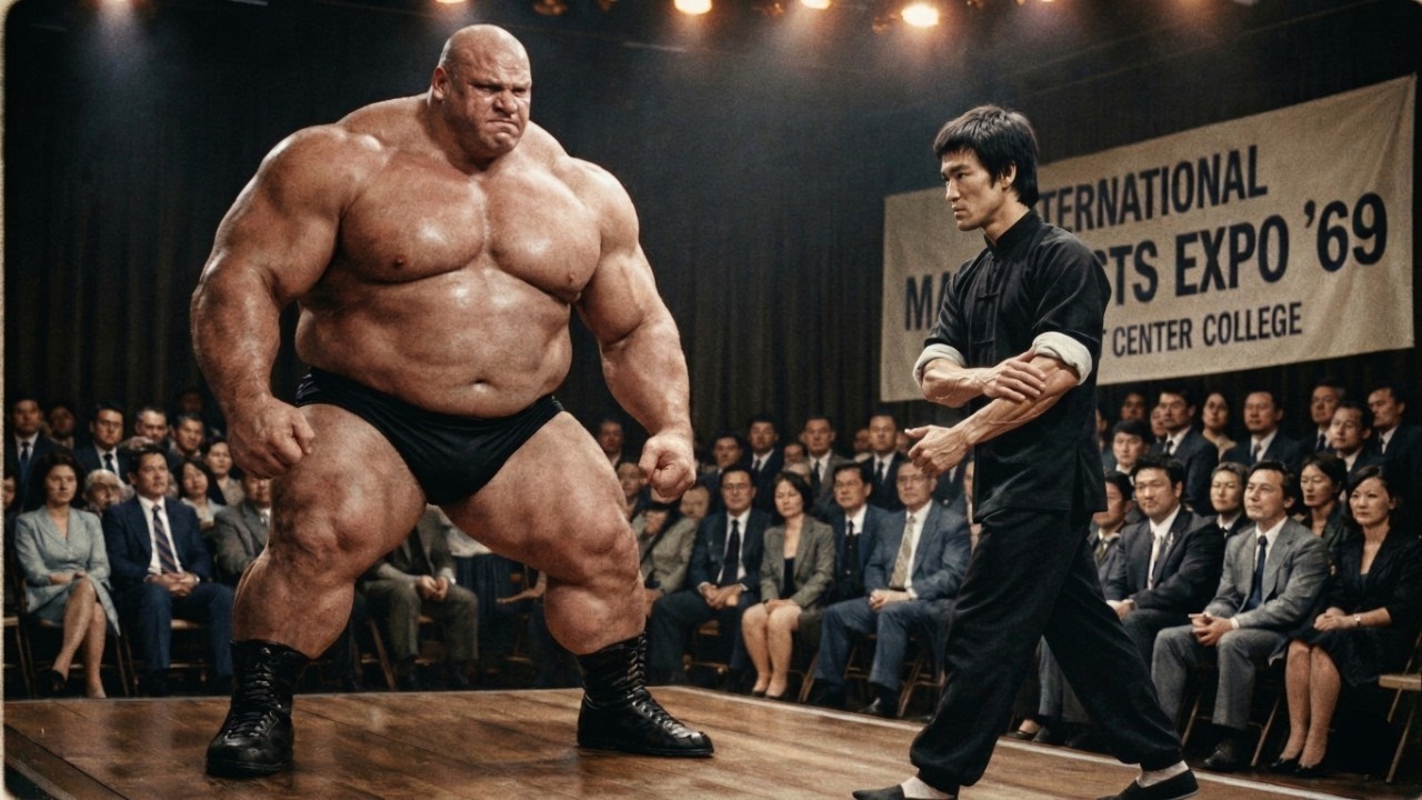 ” >> [clears throat] >> And something behind his eyes just changed. 3 days ago, his student Dan Inosanto called him. Dan had two extra tickets to the expo. But that was not why he called. He called because he knew what Bruce Lee could never resist. A problem that no one had solved. Dan said, “There’s a giant at the expo. Almost 500 lb.