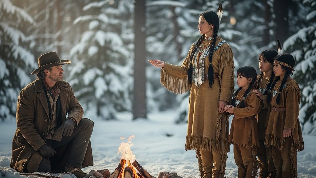 Her dark hair was tangled and dusted with snow, her face drawn with exhaustion. Three small children stood close behind her, pressed together for warmth, their thin blankets barely holding back the freezing air. The youngest could not have been more than four, his hands red and trembling. The woman met the cowboy’s eyes, not with anger or fear, but with something far worse. Quiet desperation.