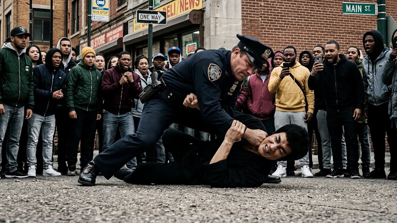 A bus had slowed at the corner. Two teenagers were already yelling over each other, each convinced they had seen how it started. Nobody had, not really. They had only seen the middle. The shove, the stumble, the blur of motion, and now this. A uniformed cop pinning down a wiry Asian man who, from the angle everyone was seeing, looked small, pinned, and beaten.