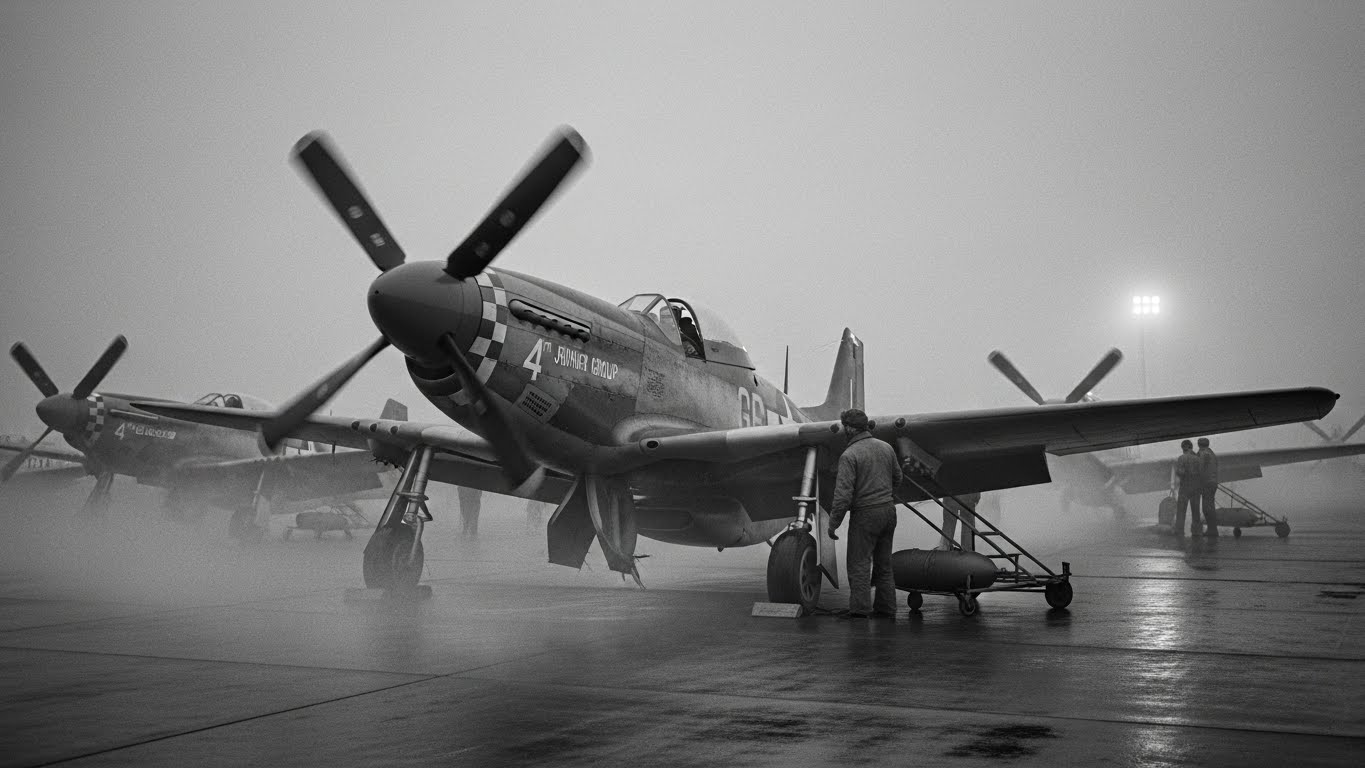 The predawn airfield is alive with motion. Floodlights cut through mist as ground crews swarm around rows of polished aluminum fighters. Their noses are painted bright red — the mark of the 4th Fighter Group. Beneath one wing, a mechanic finishes locking a drop tank into place and slaps the metal twice for luck.