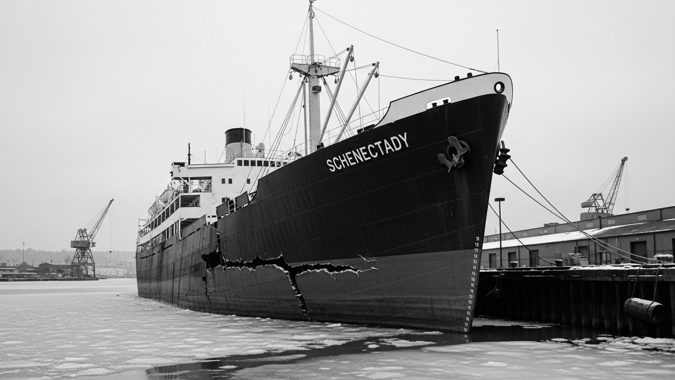 In January 1943, the Liberty Ship SS Schenectady sits moored in the frigid waters of Portland Harbor, Oregon. There is no storm. No enemy attack. No warning. Then, without a sound loud enough to draw attention, the ship’s hull splits open — a jagged fracture running the length of the deck and down the side, as if torn by an invisible hand.