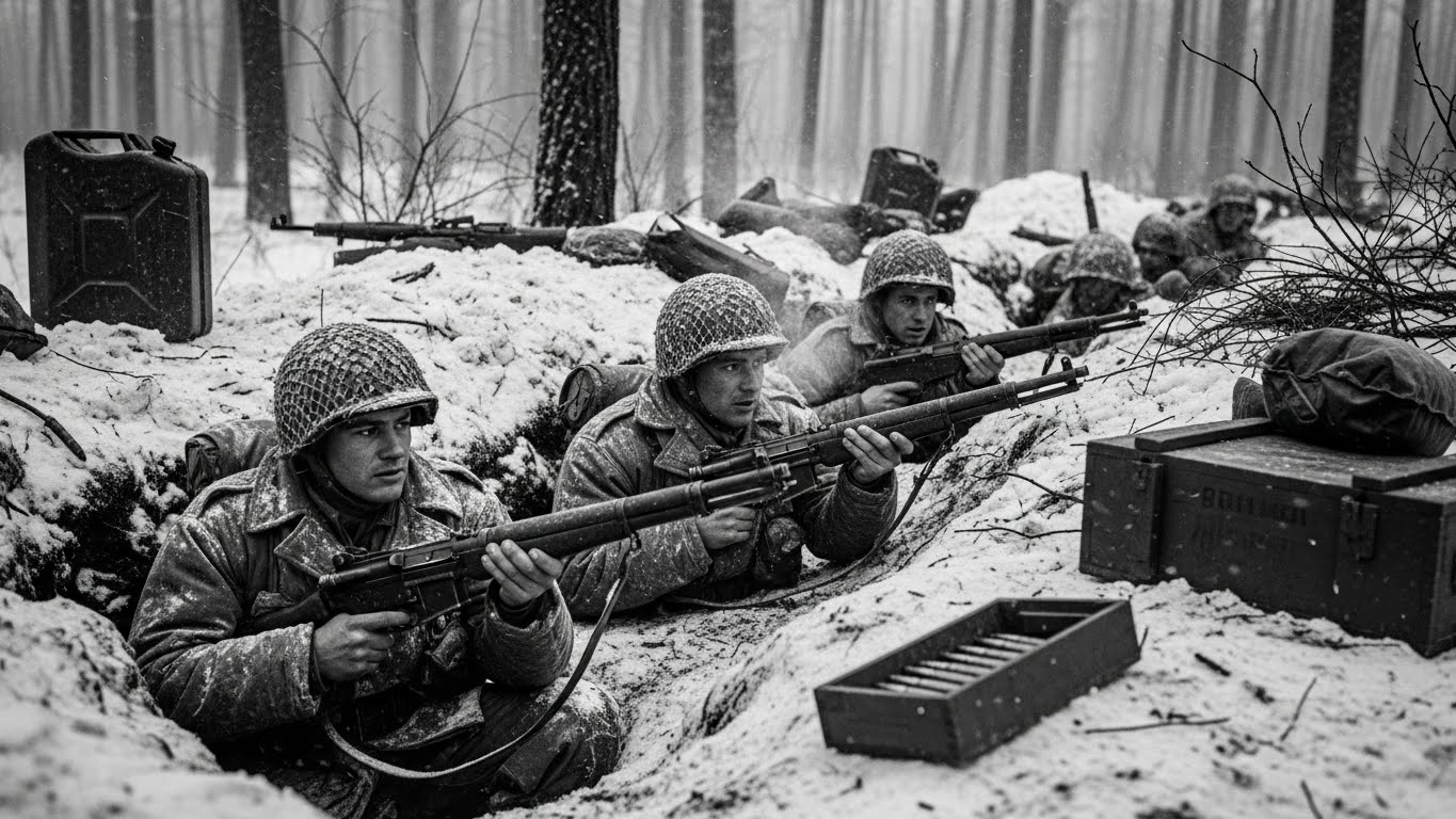 Snow falls on the Ardennes as German forces launch their last major offensive — the Battle of the Bulge. For a brief, dangerous moment, Allied lines bend. Fuel dumps are overrun. Supply routes are cut. American units dig in with dwindling ammunition, the cold biting harder than the enemy.