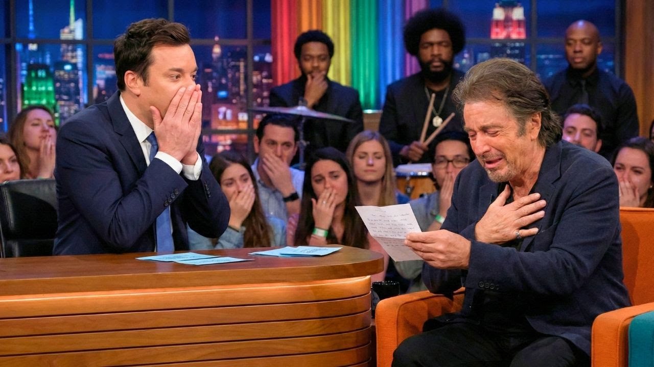 Behind the scenes, Fallon made a decision that defied every producer’s expectation. Jimmy was still kneeling beside Al’s chair. The legendary actor was clutching the note like it was the most valuable thing he’d ever held. The audience sat in absolute silence, many of them crying, all of them understanding they were witnessing something that transcended entertainment. Jimmy made a decision.