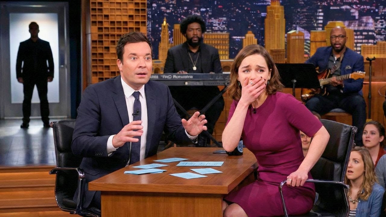 The voice came from the back of the studio. Amelia Clark stopped talking, stood up, and Jimmy Fallon had no idea what was happening. It was a Tuesday night in March 2024. The Tonight Show starring Jimmy Fallon. Studios 6A at 30 Rockefeller Plaza. Cameras rolling live. Amelia Clark was in a guest chair, radiant in an elegant emerald dress, telling a funny story about the final season of Game of Thrones. The audience was laughing.