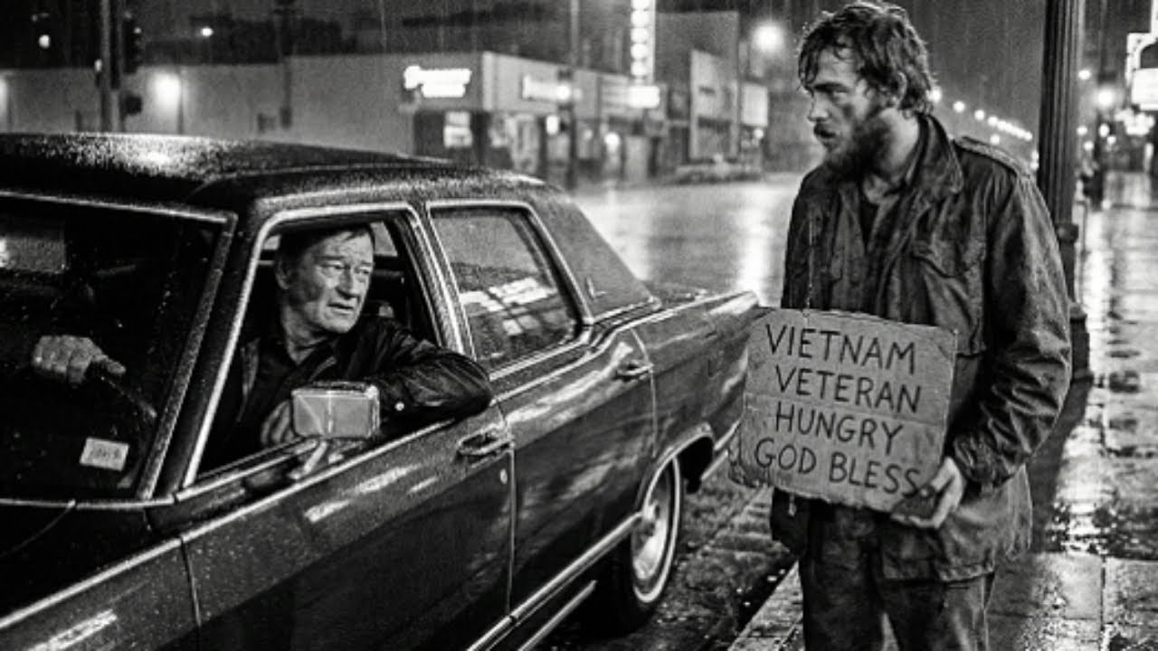 December 1972. John Wayne sees a homeless veteran standing in the rain holding a cardboard sign. Wayne drives past.  Two blocks later, he makes a decision that saves a man’s life. Here is the story. The traffic light is green, but John Wayne isn’t moving. His car sits at the intersection. Rain pours down.