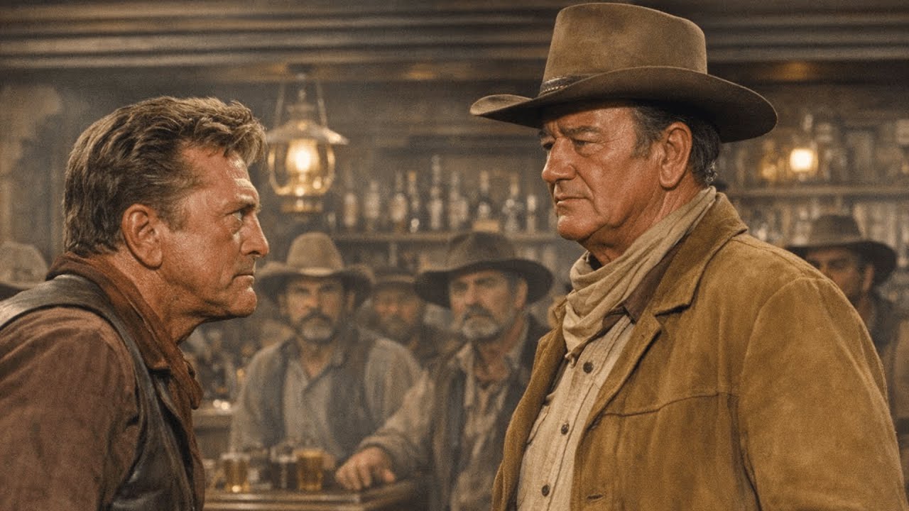 The glass exploded against the bar, missing Kirk Douglas’s head by inches. John Wayne stood frozen 10 ft away, arm still extended from the throw, his face twisted with a kind of anger no one on that set had ever seen before. You want to tell me how to play this scene again. Wayne’s voice cut through the saloon like a gunshot.