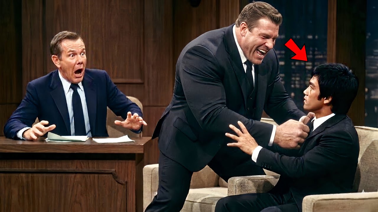 Phil Kaplan cut to black. 4 seconds of dead air followed, the longest unplanned silence in Tonight Show history. He barely touched him. That little guy in the suit, 141 lbs, put a 450 lb man on the floor with something I still cannot describe. It was not a punch or a push. Bruce Lee put his jacket back on, straightened his tie, looked at Renick without satisfaction or triumph, and walked backstage.