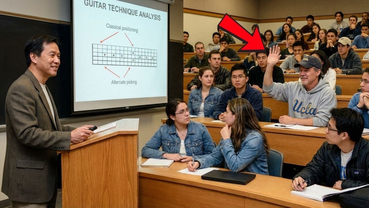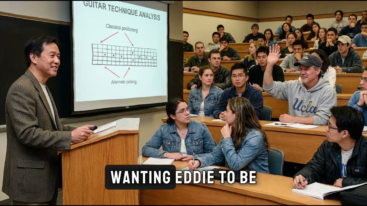 Students were taking notes, nodding along, absorbing information that was incorrect. He raised his hand. Dr. Chen noticed. Yes, question from the back. Eddie stood up slightly so his voice would carry. I have a question about the hand positioning. You said Van Halen uses classical positioning and alternate picking during the tapping sections.