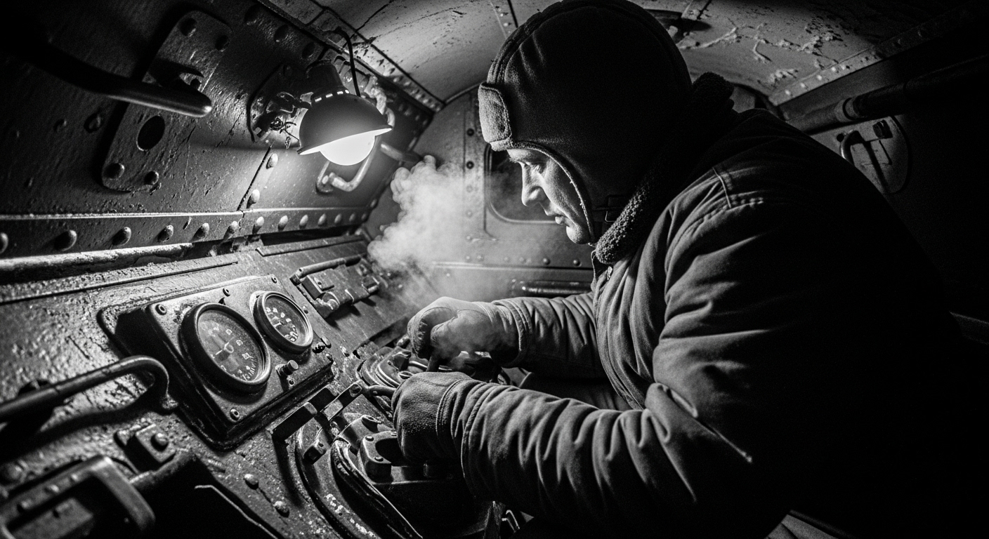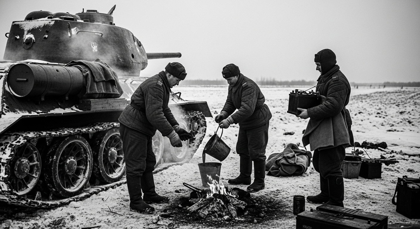 Micro-scene: Dawn. A Soviet maintenance crew works barehanded for seconds at a time, rotating men to avoid frostbite. They drain oil into buckets at night, storing it near fires so it can be poured back in at first light. Batteries are removed and kept warm under blankets. A driver taps the starter. The engine hesitates, then catches. The relief is physical.