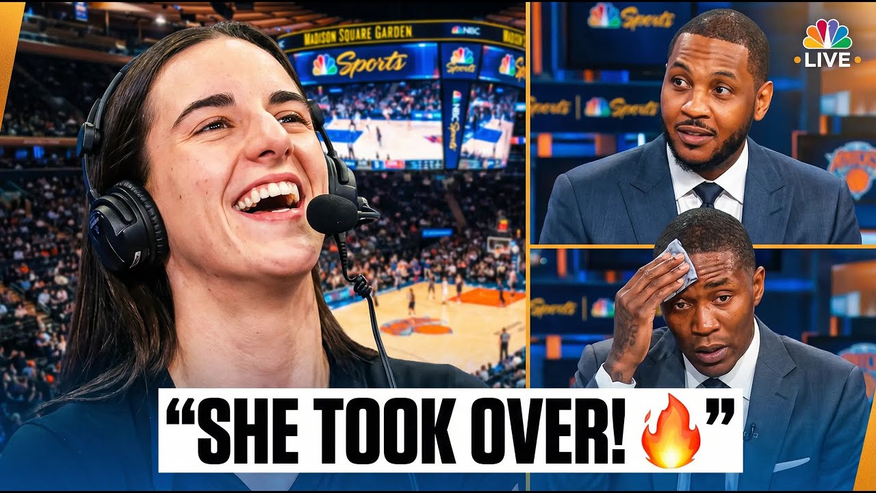 In the world of professional sports, there are guest appearances, and then there are power moves. What unfolded recently at Madison Square Garden during the NBC Sports broadcast of the New York Knicks game was unequivocally the latter. Caitlin Clark, the WNBA sensation who has spent the last year shattering records and viewership ceilings, didn’t just wave to the crowd from courtside. She orchestrated what can only be described as a charming, “hostile takeover” of the NBA’s premier stage, leaving legends like Carmelo Anthony, Reggie Miller, and Jamal Crawford in a state of sheer reverence.