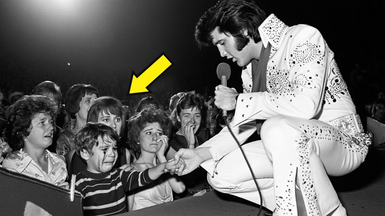The stadium fell into a strange silence. No music, just breathing, echo, and the tiny sobs of a child. Every camera pointed toward the front row. Elvis crouched near the edge of the stage, eyes locked on the boy. Hey little man,” he said softly, his voice trembling through the mic. “What’s your name?” The boy didn’t answer, just held up the sign again.