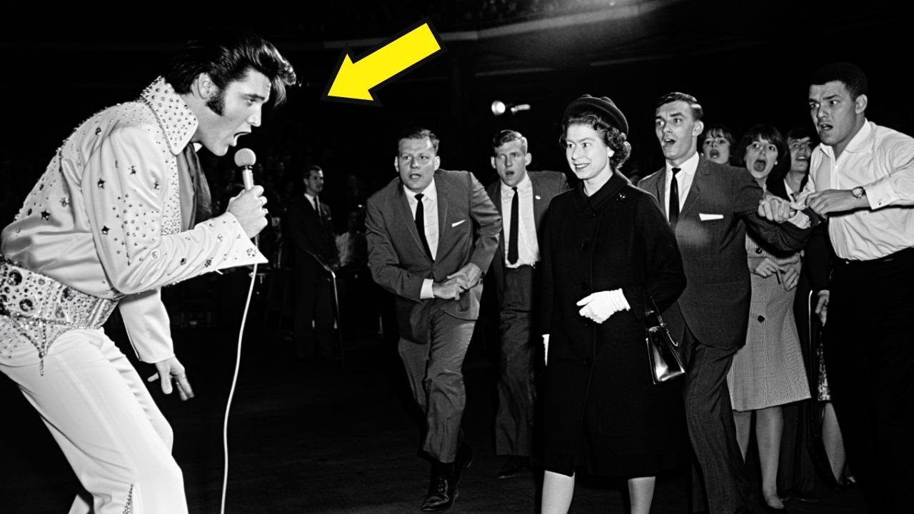 The spotlight stayed on Elvis, but his eyes were locked on someone in the third row. Queen Elizabeth II had just walked in. No cement. No fanfare. Just the Queen of England appearing in the middle of a rock and roll concert. Security rushed toward her. But Elvis did something that made them freeze in their tracks.