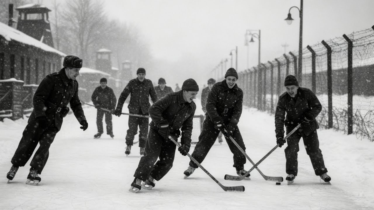 That Thursday, Hans laced up a pair of borrowed skates and stepped onto the ice for the first time in 5 years. The frozen pond stretched about 30 m across, surrounded by snow-covered trees. Other prisoners joined him, some wobbling on uncertain legs, others gliding smoothly. Canadian guards skated out too, dividing into teams.