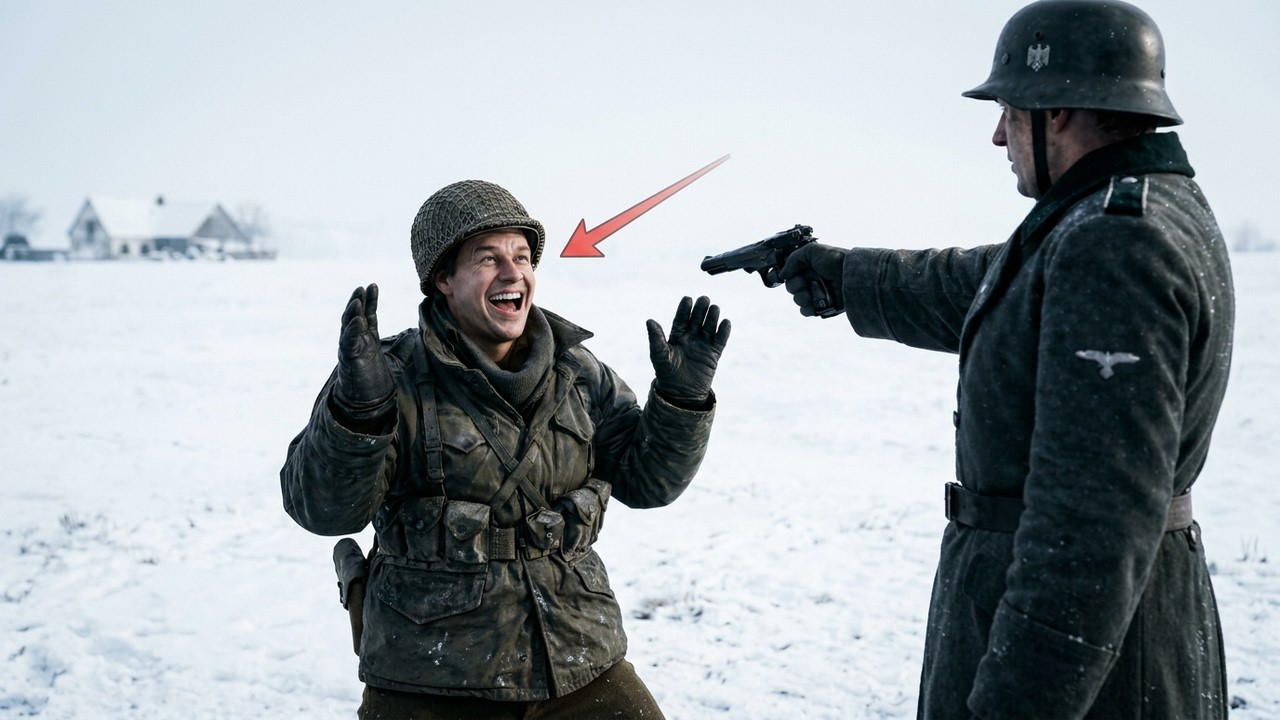 And in combat, seconds matter. Still laughing, Funk slowly raises his hands. Not in surrender, but toward the sling of his Thompson submachine gun. The German officer watches closely. The movement appears compliant. The American is about to hand over his weapon. Funk grips the Thompson and eases it forward as if preparing to relinquish it.