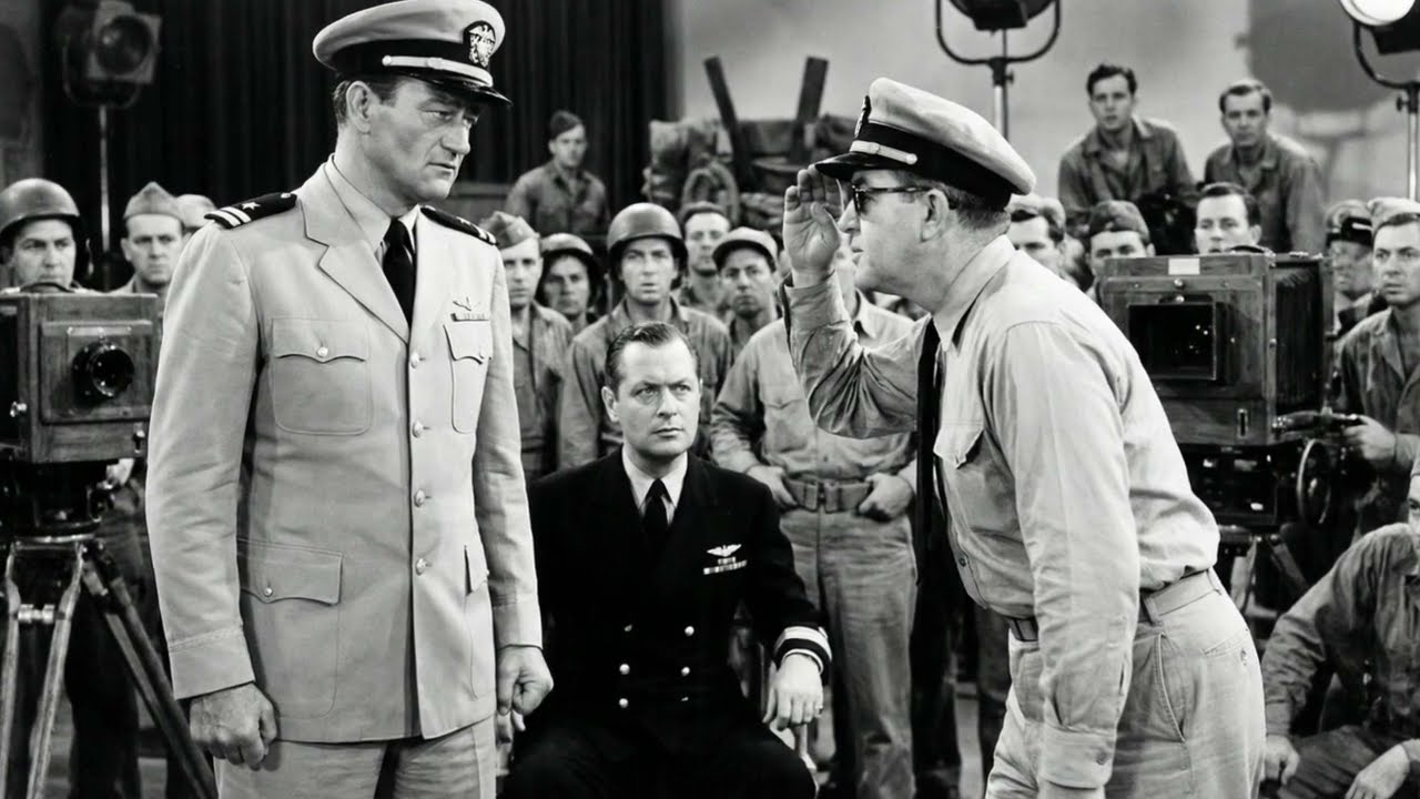 Came home with the Purple Heart. The credits will say directed by John Ford, Captain USNR. [music] Wayne’s credit will just say his name. No rank, no service. Everyone on set knows it. Assistant director calls out, “Quiet on set, rehearsing the departure scene.” This is a simple shot. An admiral is leaving.